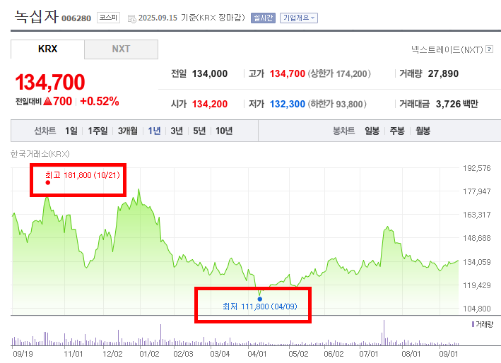 - 4월 이후부터 9월까지는 부분적인 회복세와 횡보 국면이 혼재된 모습이다. 완만한 상승 흐름 속에서 주가는 130,000원대 중반에서 등락하며 상대적으로 안정적인 모습을 유지하고 있다. 투자자들은 녹십자의 장기 성장 가능성에 여전히 기대를 걸면서도 단기 변동성에 신중한 태도를 보이는 상황이다.