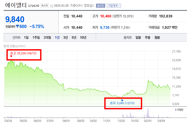 - 전체적으로 에이엘티 주가는 2024년 3월 말부터 2025년 3월 말까지 큰 변동성을 보였다.