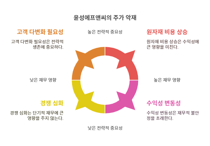 윤성에프앤씨의 매출은 SK온, LG에너지솔루션 등 소수 대형 고객사에 집중되어 있다. 이들 기업의 투자 계획 변경이나 수요 감소는 실적에 직접적인 타격을 줄 수 있다. 고객 다변화가 시급한 과제로 떠오른다.