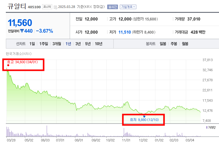 - 전체적으로 큐알티 주가는 2024년 3월 말부터 2025년 3월 말까지 큰 변동성을 보였다.